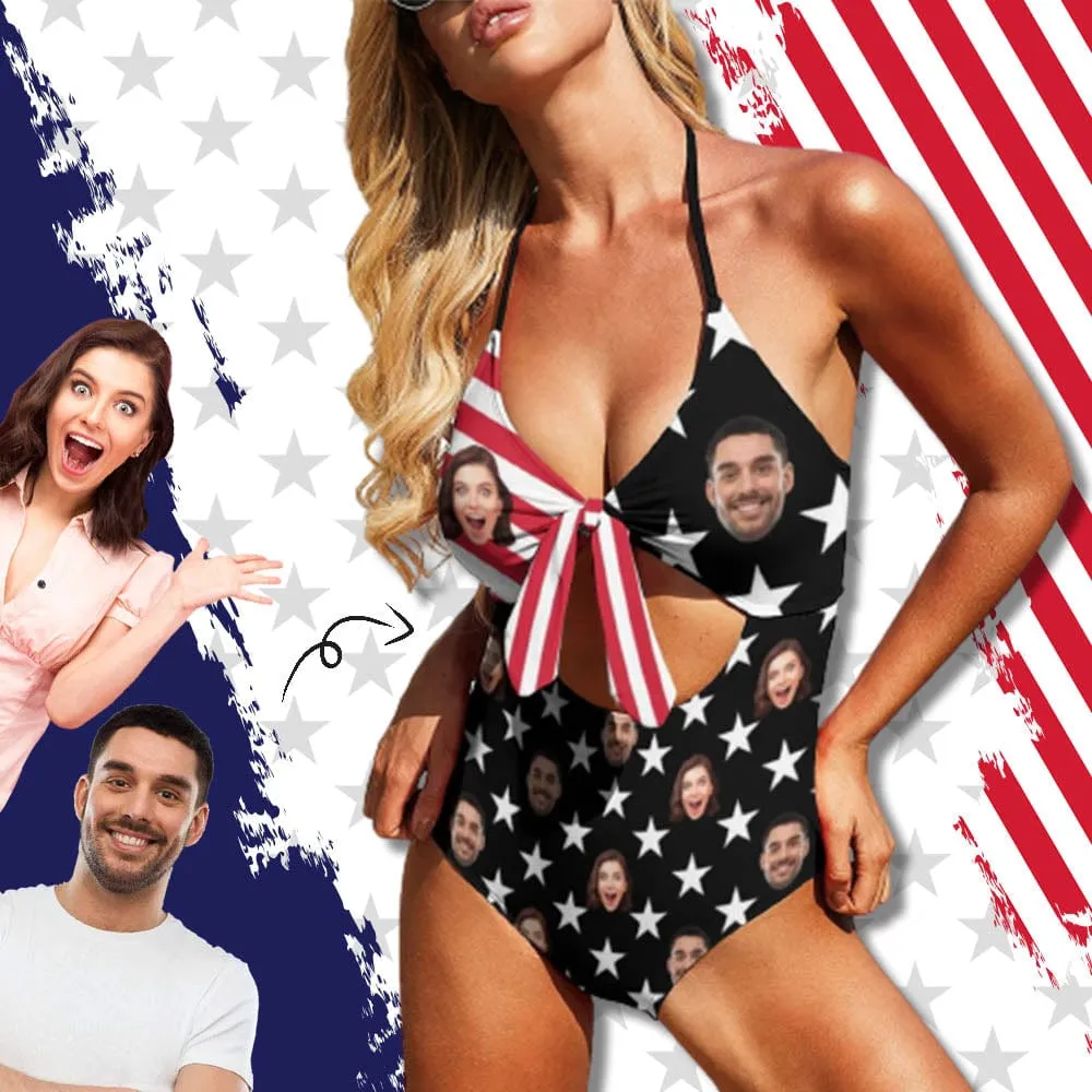 American Flag Monokini Custom Couple Face Flag Swimsuit Personalized Women's Backless Bow One Piece Bathing Suit